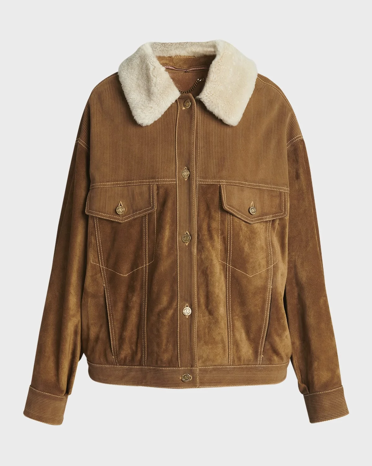 Golden Goose "Journey" suede jacket featuring corduroy detailing and a removable fauxfur collar Dropped shoulders Long sleeves with button cuffs Dual chest pockets Side slip pockets Relaxed fit Hem falls to the hip Buttonfront Leather/acetate Professional cleaning recommended Made in Italy