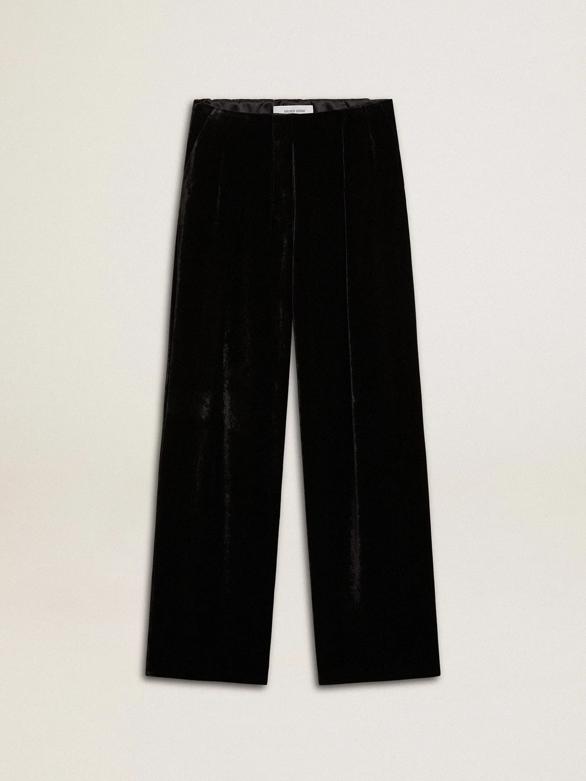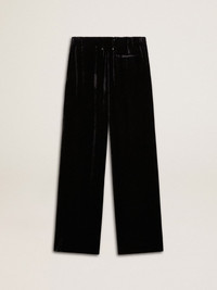 Inspired by the electric energy of the Nineties, the collection celebrates the limitless power of shared dreams. Moved by passion, each design captures the meaning of togetherness and the power of music. In black silk blend, these velvet-effect pants feature a loose leg and pleats on the front. The elasticated inner waistband adds the finishing touch. DETAILS Item No. GWP02184.P001161.90100 - Journey Collection - Color: black - Loose fit - Velvet effect - Elasticated silk inner waistband - Double star on the back - Front fastening with inner hook - Main material: 82% viscose, 18% silk - Made in Italy The model is 177 cm tall and is wearing a size 40.