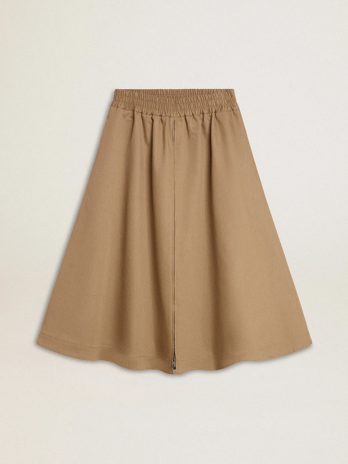 A collection inspired by the harmony of nature, where every detail flows with ease. In a cotton blend, this midi circle skirt features a front zip and an elasticated waist. Two pockets add a casual touch. DETAILS Item No. GWP01953.P001558.15369 - Journey Collection - Color: beige - Midi length - Elasticated waistband - Double star on the back - Full front zip - Two pockets - Main material: 40% elastomultiester, 40% cotton, 20% polyester - Inner material: 100% cotton - Made in Italy The model is 177 cm tall and is wearing a size 40.