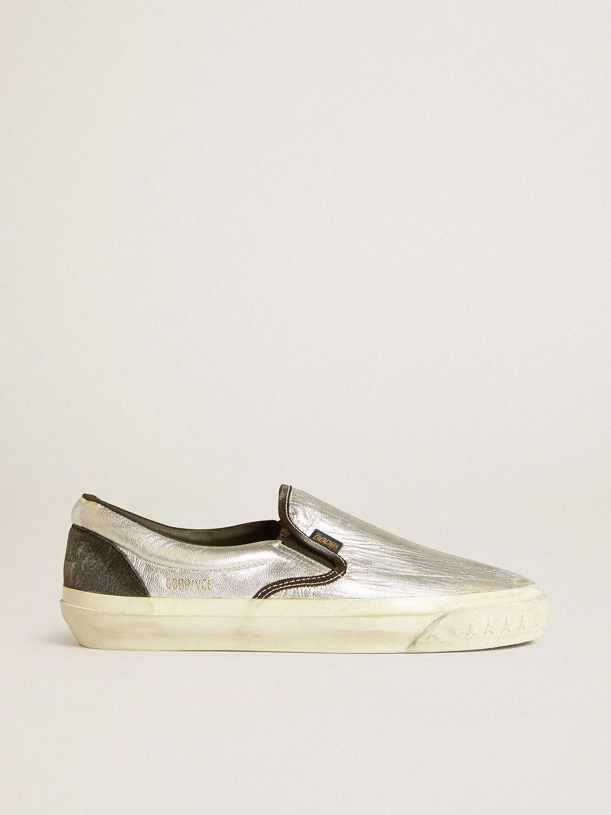 VCE speaks a simple language. Channeling the carefree image of California skate culture, the slip-on design embodies comfort, versatility and freedom of movement. This women's model with a rubber toe and metallic silver leather upper features a black leather heel tab. DETAILS Item No. GWF00306.F006945.60246 - Silver metallic leather upper - Black leather heel tab - Lived-in finish - "VCE" soft insole - Stars on the sole - "Golden Goose" embossed on the heel - Upper: 100% cow leather - Lining: 39% cotton, 38% polyurethane textile, 15% polyester, 8% viscose - Sole: 100% rubber - Handmade - Made in Italy