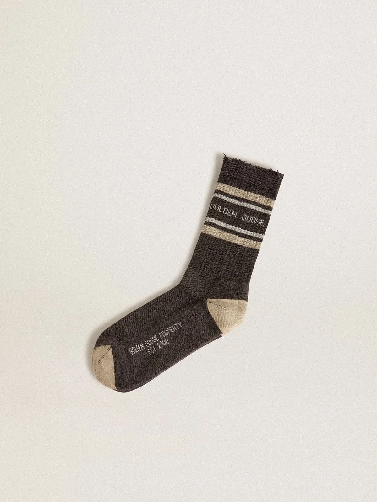 A vintage feel is one of our distinctive components: these dark gray socks feature distressed details on the leg, and cream and worn-white stripes. DETAILS Item No. GUP00883.P002205.60621 - Star Collection - Color: dark gray - Cream and worn-white stripes - Distressed details - 'Golden Goose property' cream print on the sole - Unisex - Main material: 67% cotton, 29% polyester, 4% spandex - Made in Italy