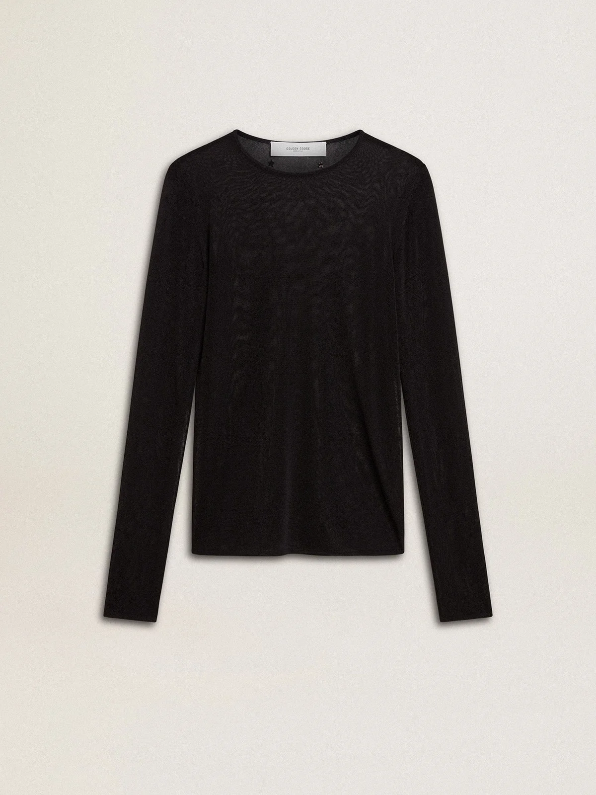 Inspired by the electric energy of the Nineties, the collection celebrates the limitless power of shared dreams. Moved by passion, each design captures the meaning of togetherness and the power of music. This black crew neck t-shirt has a tight fit. The double star on the back adds the finishing touch. DETAILS Item No. GWP02238.P001971.90100 - Journey Collection - Color: black - Tight fit - Second skin effect - Double star on the back - Long sleeves - Main material: 76% viscose, 24% nylon - Rib material: 76% viscose, 24% nylon - Made in Italy The model is 177 cm tall and is wearing a size S.