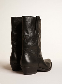 From Texas to Venice: our Wish Star Boots tell of our journey and our passions, creating a unique combination of Venetian artisan tradition and cowboy spirit. In this low version, these boots feature a black leather upper with black leather inlay star, and tone-on-tone embroidery on the leg. The black piping detail and gold-colored metal plaque engraved with the Golden Goose signature on the heel complete the look. DETAILS Item No. GWF00537.F004470.90100 - Color: black - Black leather inlay star - Black embroidery on the leg - Black piping detail - Gold-colored metal plaque engraved with the Golden Goose signature on the heel - Vintage finish - Heel height: 4 cm - Leg height: 25 cm - Upper: 100% cow leather - Lining: 100% cow leather - Sole: 100% cow leather - Handmade - Made in Italy