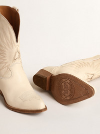 From Texas to Venice: our Wish Star Boots tell of our journey and our passions, creating a unique combination of Venetian artisan tradition and cowboy spirit. In this low version, these boots feature a cream-colored leather upper with tone-on-tone inlay star, and tone-on-tone stitching embroidery on the leg and toe. The cream-colored piping detail and gold-colored metal plaque engraved with the Golden Goose signature on the heel complete the look. DETAILS Item No. GWF00136.F004886.11406 - Color: cream - Cream-colored leather inlay star - Cream-colored embroidery on the leg - Cream-colored embroidery on the toe - Cream-colored piping detail - Gold-colored metal plaque engraved with the Golden Goose signature on the heel - Vintage finish - Heel height: 4 cm - Leg height: 25 cm - Upper: 100% cow leather - Lining: 100% cow leather - Sole: 100% cow leather