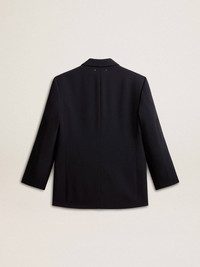 A love story to our home, Marghera. Where everything began. Our latest collection reflects the spirit of our birthplace, its contrasts, industrial soul, and manufacturing landscapes, weaving together inspirations from both the vibrant energy of workwear and the refined essence of traditional tailoring. This women's jacket in a black wool blend features a boyfriend fit with two branded horn buttons on the front. The inner lining with a white and beige geometric print adds the finishing touch. DETAILS Item No. GWP02069.P001619.50866 - Journey Collection - Color: black - Double star on the back - Button fastening - Two pockets on the front - Boyfriend fit - Long sleeves - Jacquard viscose lining - Main material: 70% viscose, 30% virgin wool - Pocket lining: 100% cotton - Lining material:: 100% polyester - Made in Italy The model is 177 cm tall and is wearing a size 40.