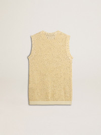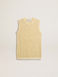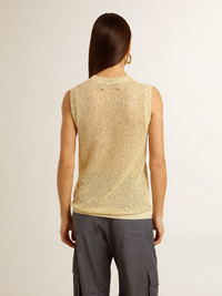 A love story to our home, Marghera. Where everything began. Our latest collection reflects the spirit of our birthplace, its contrasts, industrial soul and manufacturing landscapes, weaving together inspirations from both the vibrant energy of workwear and the refined essence of traditional tailoring. This regular-fit mesh knit top with sequins is made with a special sewing technique that allows the sequins to be on the outside of the garment and not be in direct contact with the skin. The crew neck features ribbed cotton details at the hem. DETAILS Item No. GWP01922.P001691.11560 - Journey Collection - Color: aged white - Sequins - Double star on the back - Sleeveless - Round neck - Regular fit - Main material: 75% polyamide, 25% cotton - Contrasting material: 100% cotton - Made in Italy The model is 177 cm tall and is wearing a size S.