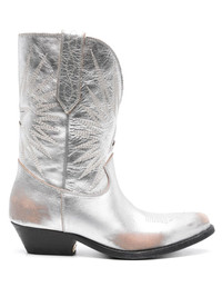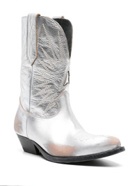 metallic-leather Western boots Drawing inspiration from cowboy spirit, Golden Goose presents these silver-tone leather boots. With a pointed toe and Cuban heel, they're accented with intricate embroidery depicting a star - a brand signature. Highlights - Silver-tone - Calf leather - Metallic effect - Western-style panelling - Embroidered motif - Logo cut-out to the rear - Pull-on style - Pointed toe - Double pull-tab at the opening - Leather lining - Branded insole - Cuban heel - This piece comes complete with a protective dust bag. Made in Italy Composition Lining: Calf Leather 100% Outer: Calf Leather 100% Sole: Calf Leather 100% SIZE & FIT Measurement CIRCUMFERENCE 11.81 in(30 cm) HEEL 1.57 in(4 cm) HEIGHT 9.05 in(23 cm) Sole height 0.39 in(1 cm)