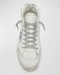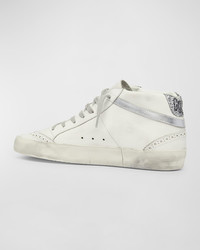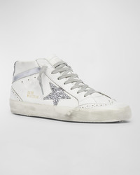 - Golden Goose "Mid Star" leather and cotton sneakers with glitter accent - Signature star on side - Flat heel - Wing-tip round toe - Lace-up vamp - Signature-stained rubber outsole - Lining: Leather/cotton - Made in Italy