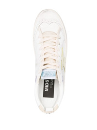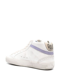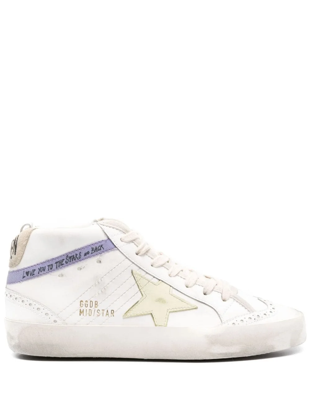 Mid Star hi-top sneakers Golden Goose combines streetwear influences with glamour features. Crafted from leather with a distressed finish, this Mid-Star pair features is made from white leather and is adorned with the signature star patch to the sides, along with a purple slogan-embellished stripe. Highlights - White/multicolour - Calf leather - Distressed effect - Round toe - Perforated detailing - Logo patch at the tongue - Applique logo to the side - Logo print to the side - Branded heel counter - Pull-tab at the heel - Ankle-length - Branded insole - French terry lining - Flat rubber sole - Front lace-up fastening Made in Italy Composition Leather 100% SIZE & FIT Measurement HEEL 1.18 in(3 cm) HEIGHT 2.75 in(7 cm) Sole height 0.98 in(2.5 cm)