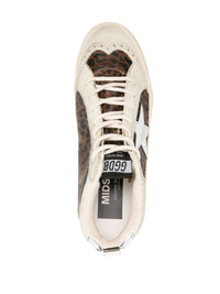 Mid Star high-top sneakers Golden Goose's Mid Star sneakers are reimagined each season: this pair are adorned with metallic and leopard-print panelling. Staying true to the brand’s love-worn aesthetic, they’re complete with signature distressing and a classic star motif at the sidewall. Highlights - Brown/off-white/silver-tone - Calf leather - Leopard print - Panelled design - Round toe - Signature ghillies brogue trim - Front lace-up fastening - Logo patch to the front - Pull-tab at the heel - Contrasting branded heel counter - Logo print to the side - Signature star patch to the sides - Flatform sole - Distressed effect - Branded leather insole - French terry lining Made in Italy Composition Outer: Calf Leather 100%, Fabric 100% Lining: Calf Leather 100%, Fabric 100% Sole: Rubber 100% SIZE & FIT Measurement HEEL 1.18 in(3 cm) Sole height 0.59 in(1.5 cm)