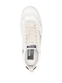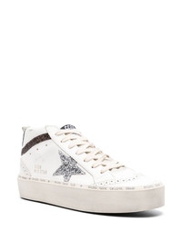 Mid Star high-top sneakers Golden Goose's Mid Star sneakers are reimagined each season: this pair are adorned with glittered detailing. Staying true to the brand’s love-worn aesthetic, they’re complete with signature distressing and a classic star motif at the sidewall. Highlights - White/silver-tone/brown - Calf leather - Smooth grain - Glitter detailing - Signature ghillies brogue trim - Round toe - Front lace-up fastening - Logo patch at the tongue - Pull-tab at the heel - Contrasting branded heel counter - Signature star patch to the sides - Flatform sole - Slogan print to the sole - Branded insole Made in Italy Composition Leather 100% SIZE & FIT Measurement HEEL 1.18 in(3 cm) Sole height 0.78 in(2 cm)