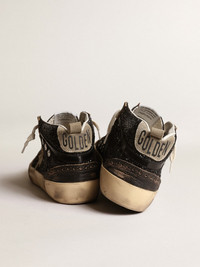 Uniquely elegant versatility: the Mid Star sneakers take a refined approach to their Eighties skate scene inspiration. This model with a black glitter upper accentuated by glossy black leather inserts features a dove-gray suede star and glossy black leather flash. The dove-gray suede heel tab and cream-colored laces complete the look. DETAILS Item No. GWF00122.F003978.90365 - Black glitter upper - Dove-gray suede star - Dove-gray suede heel tab - Glossy black leather flash - Glossy black leather inserts - Broguing detail - Cream laces - Vintage finish - Upper: 43% polyethylene terephthalate, 38% cow leather, 19% cotton - Lining: 55% cotton, 37% cow leather, 4% polyamide, 4% textile polyurethane - Sole: 100% rubber - Handmade - Made in Italy