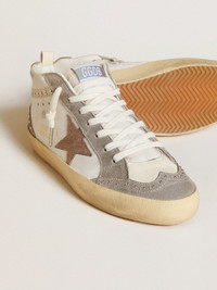 Uniquely elegant versatility: the Mid Star sneakers take a refined approach to their Nineties skate scene inspiration. With a white nappa leather upper accentuated by silver suede inserts with gold studs, this model features a light brown metallic leather star and a beige cotton flash with gold studs. The silver-colored suede heel tab and white laces complete the look. DETAILS Item No. GWF00122.F006624.12130 - White nappa leather upper - Light brown metallic leather star - Silver suede heel tab - Beige cotton flash with gold-colored studs - Silver suede inserts with gold studs - White nylon tongue - Inserts with broguing - White laces - Vintage finish - Upper: 60% sheepskin leather, 29% cow leather, 11% polyamide - Lining: 55% cotton, 23% cow leather, 14% textile polyurethane, 5% polyester, 3% viscose - Sole: 100% rubber - Handmade - Made in Italy
