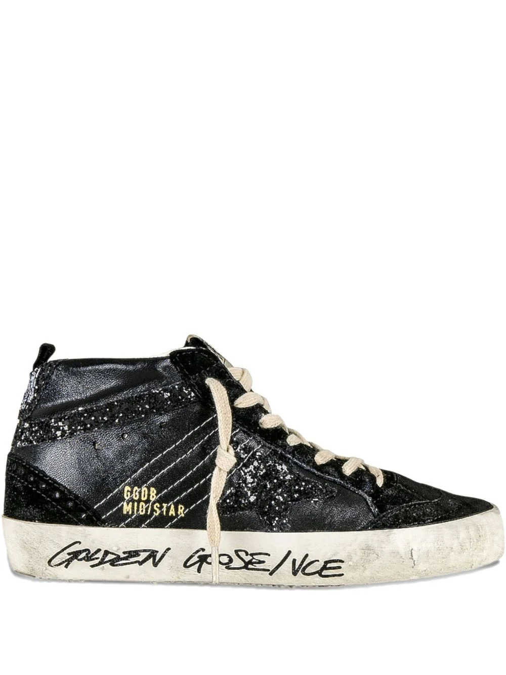 Mid Star "Glitter/Black" sneakers Nodding to the eighties skateboarding culture, these Mid Star sneakers feature mix-media elements of calf suede and are detailed with Golden Goose's signature star patch to the side. Distressing on the collar and rubber sole complete the look with a distinctive lived-in feel. Highlights - Black - Front lace-up fastening - Signature star patch to the sides - Glitter detailing - Distressed effect - Pull-tab at the heel - Logo patch at the tongue - Round toe - Flat rubber sole - These styles are supplied by a premium and authenticated sneaker marketplace. stocking only the most sought-after footwear, they source and curate some of the most hard to find sneakers from around the world. Imported Composition Outer: Calf Leather 100% Sole: Rubber 100% Lining: Calf Leather 100% SIZE & FIT Measurement Sole height 1.18 in(3 cm)
