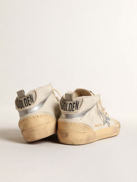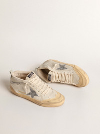 Uniquely elegant versatility: the Mid Star sneakers take a refined approach to their Nineties skate scene inspiration. This model with a white leather upper features a silver glitter star and a mat-effect silver metallic leather flash. The ice-gray suede heel tab and white laces complete the look. DETAILS Item No. GWF00122.F004530.82285 - Color: white - Silver glitter star - Ice-gray suede heel tab - Mat-effect silver metallic leather flash - Contrasting black signature on the flash - Vanilla rubber inserts with broguing - White trim - White laces - Vintage finish - Upper: 62% cow leather, 13% polyester, 13% cotton, 10% polyamide, 2% polyethylene - Lining: 65% cotton, 26% cow leather, 6% polyester, 3% polyurethane - Sole: 100% rubber - Handmade - Made in Italy