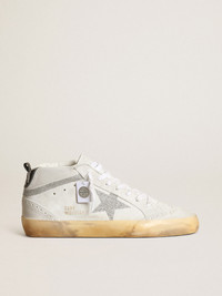 Uniquely elegant versatility: the Mid Star sneakers take a refined approach to their Eighties skate scene inspiration. These sneakers with a white suede upper feature a star and flash in silver-colored Swarovski micro-crystals. The black leather heel tab, broguing details and white laces complete the look. DETAILS Item No. GWF00122.F003400.10981 - White suede upper - Star in silver-colored Swarovski micro-crystals - Black leather heel tab - Flash in silver-colored Swarovski micro-crystals - Broguing details - White laces - Vintage finish - Upper: 88% cow leather, 4% textile polyurethane, 4% crystals, 4% polyamide - Lining: 56% cotton, 44% cow leather - Sole: 100% rubber