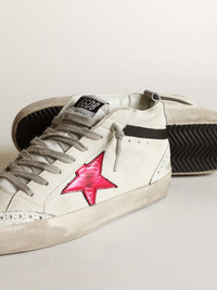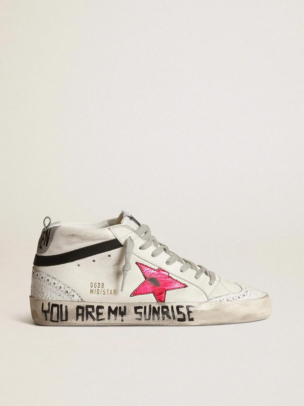 Uniquely elegant versatility: the Mid Star sneakers take a refined approach to their Eighties skate scene inspiration. With their white nappa leather upper highlighted by white crackled leather inserts, these sneakers feature a pink laminated leather star, a light gray leather heel tab and a black leather flash. The ‘You Are My Sunrise’ lettering in contrasting black on the foxing, the brogue details and ice-gray laces complete the style. DETAILS Item No. GWF00122.F003357.11231 - White nappa leather upper - Pink laminated leather star - Light gray leather heel tab - Black leather flash - White crackled leather inserts - Brogue details - ‘You Are My Sunrise’ black lettering on the foxing - Ice-gray laces - Vintage finish - Upper: 59% sheepskin leather, 29% cow leather, 6% polyester, 5% polyamide, 1% textile polyurethane - Lining: 56% cotton, 44% cow leather - Sole: 100% rubber - Handmade - Made in Italy