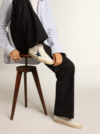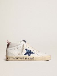 Uniquely elegant versatility: the Mid Star sneakers take a refined approach to their Eighties skate scene inspiration. This model with a white nappa leather upper features a blue glitter star and a glossy white leather flash. The pink suede heel tab, contrasting black lettering on the foxing and cream-colored laces complete the look. DETAILS Item No. GWF00122.F003979.11355 - White nappa leather upper - Blue glitter star - Pink suede heel tab - Glossy white leather flash - Broguing detail - Contrasting black lettering on the foxing - Cream laces - Vintage finish - Upper: 74% sheepskin leather, 12% cow leather, 7% polyester, 5% polyamide, 1% polyethylene terephthalate, 1% cotton - Lining: 55% cotton, 37% cow leather, 4% polyamide, 4% textile polyurethane - Sole: 100% rubber - Handmade - Made in Italy