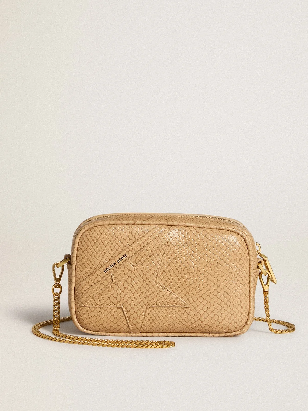 Vintage inspiration, metropolitan attitude. A versatile accessory that captures the classic design of camera bags and stands out thanks to its refined details – now also in a mini version. This model, in beige snake-print leather, features a tone-on-tone star in hammered leather. The gold-colored shoulder chain and contrasting black logo decorating the front complete the look. DETAILS Item No. 8050235824669 - Color: beige - Tone-on-tone star on the front - Contrasting black logo on the front - Inside pocket - Main material: 100% sheepskin leather - Lining: 100% polyamide - Size: 10 x 16 x 6 cm - Length of shoulder strap: 115 cm - Made in Italy