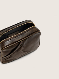 Vintage inspiration, metropolitan attitude. A versatile accessory that captures the classic design of camera bags and stands out thanks to its refined details. This model in distressed dark brown leather features a tone-on-tone star. The contrasting gold-toned chain strap and details complete the look. DETAILS Item No. 8058807117706 - Color: dark brown - Tone-on-tone leather star on the front - Tone-on-tone logo on the front - Gold-colored metallic details - Zip fastening - External phone pocket - Inside pocket - Main material: 100% cow leather - Lining: 100% cow leather - Size: 16 x 10 x 6 cm - Length of shoulder strap: 115 cm