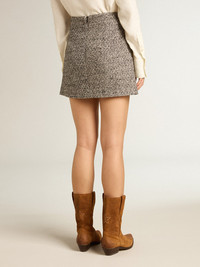 From Venice, our home, to Paris, our dream. This Journey Collection captures the essence and beauty of everyday moments in the City of Lights, immersed in a mesmerizing atmosphere where intimacy, authenticity and curiosity are the pulsating soul of it. This miniskirt in bouclé cotton features two pockets on the back and an invisible zip at the center. DETAILS Item No. GWP01817.P001344.90422 - Journey Collection - Color: black and white - Wraparound style - Two pockets on the back - Concealed snap fasteners on the front - Main material: 60% cotton, 20% polyester, 10% viscose, 10% acrylic - Lining: 100% viscose - Made in Italy The model is 177 cm tall and is wearing a size 40.
