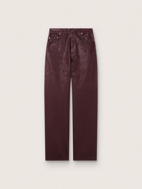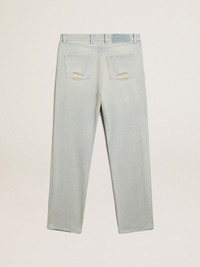 A unique, timeless collection that encompasses the essence of Golden Goose, designed to remain with you every day and accompany your highs and lows, come rain or shine. These bleached-wash jeans feature a wide leg with worn areas on the knee and cabochon crystals on the legs. The detachable white patch with a finely embroidered letter G in red adds the finishing touch. DETAILS Item No. GWP00844.P000626.50100 - Color: bleached blue - Cabochon crystals - Double gold star on the back - Detachable white patch with embroidered red letter G - Wide leg - Five pockets - Distressed treatment - Main material: 100% cotton - Pocket lining: 65% polyester, 35% cotton - Made in Italy The model is 177 cm tall and is wearing a size 27 (IT).