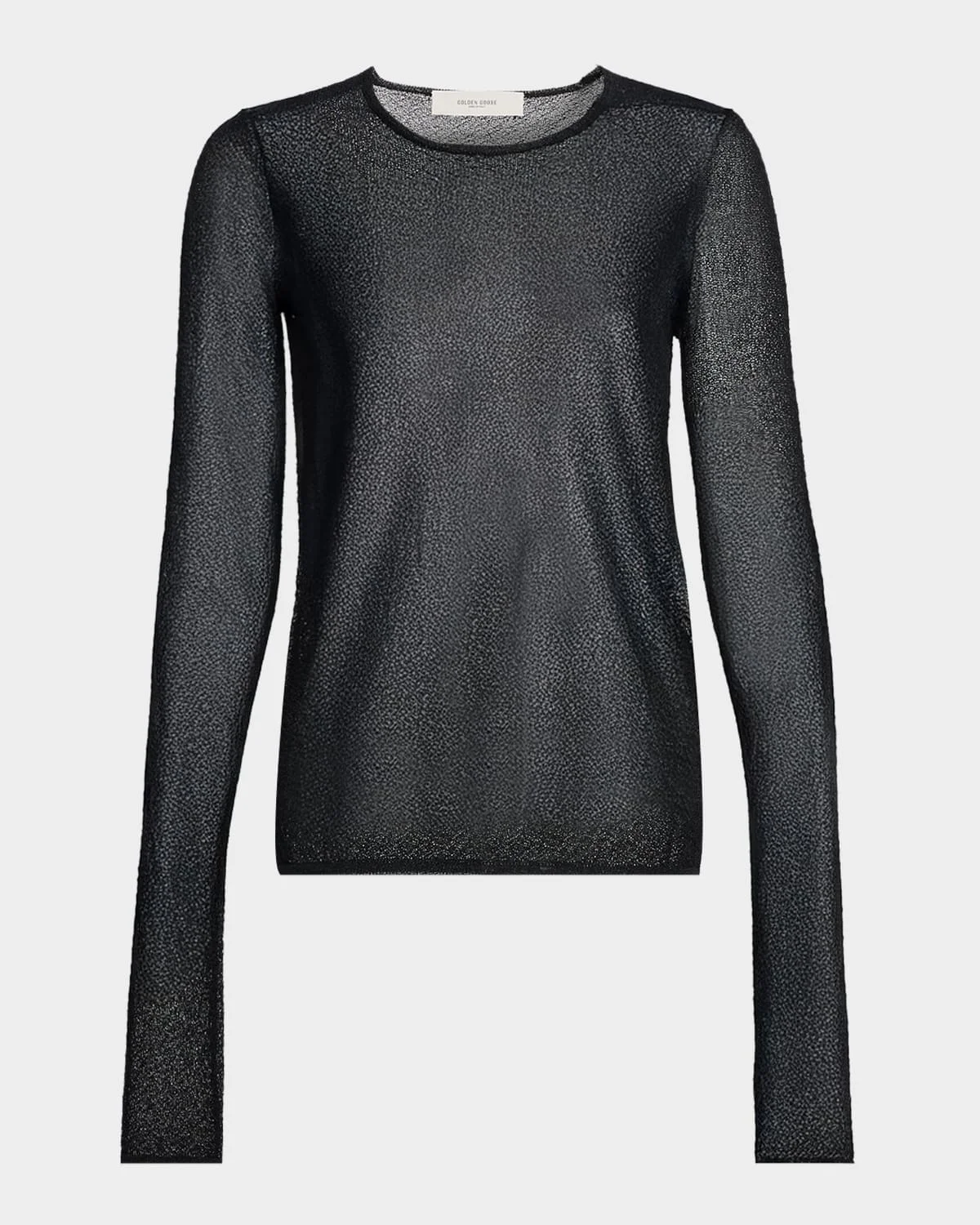 Knit from lightweight viscose for a semisheer design, the "Nella" top by Golden Goose can be styled as a base layer or worn with a tonal bra or tank top underneath for added coverage Crew neckline Long sleeves Slim fit Hip length Pullover style Viscose/nylon/polyamide Made in Italy