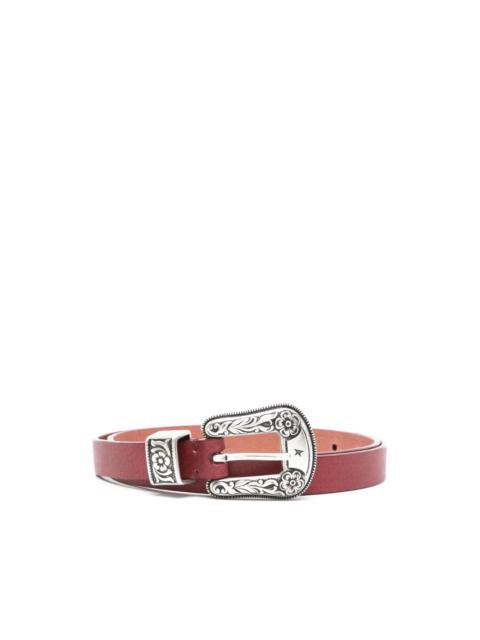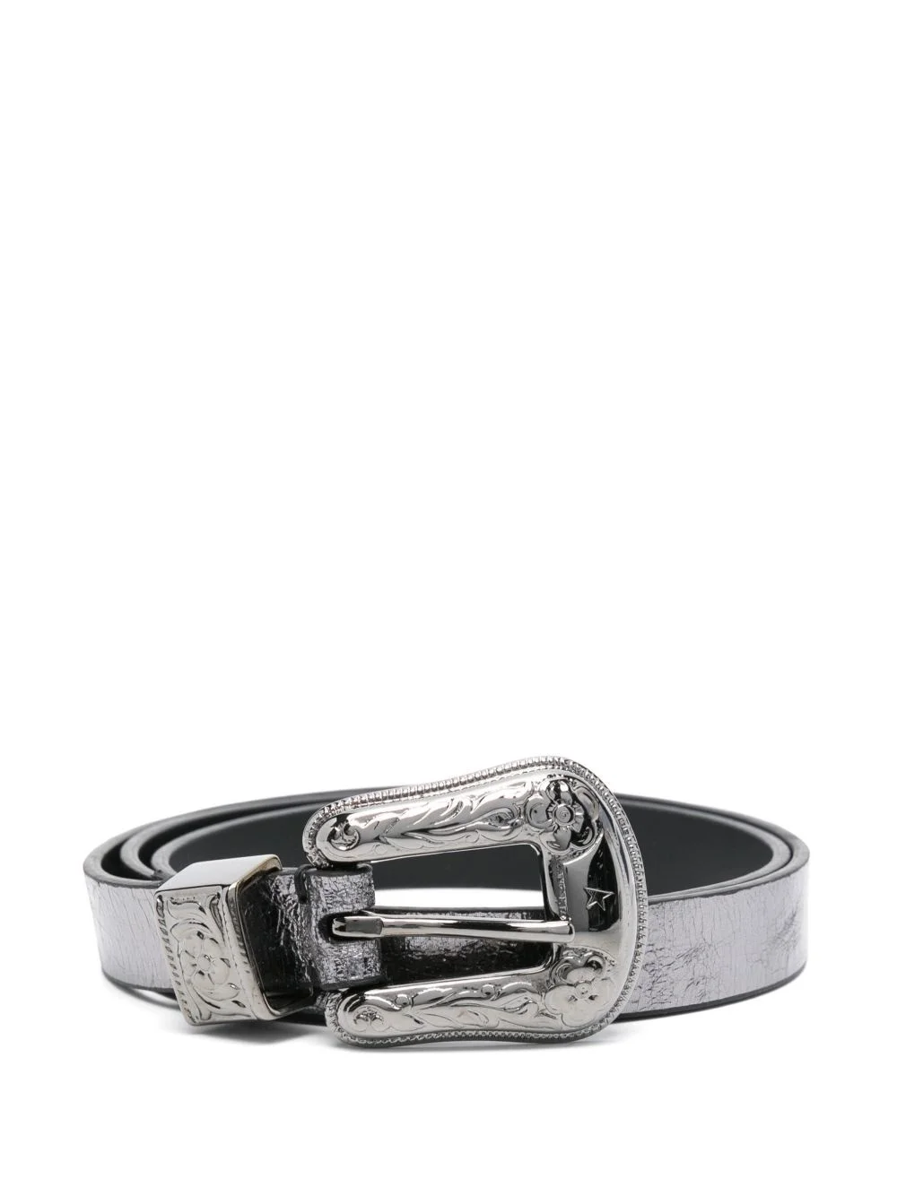 New belt Highlights - Gunmetal grey - Tang-buckle fastening - Punched holes - Single loop - Embossed detail Made in Italy Composition Metallic Leather 100% SIZE & FIT Measurement Maximum Length 33.85 in(86 cm) Minimum Length 29.92 in(76 cm) WIDTH 0.78 in(2 cm)