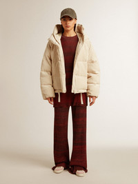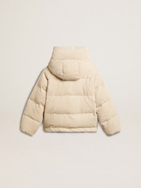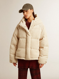 A love story to our home, Marghera. Where everything began. Our latest collection reflects the spirit of our birthplace, its contrasts, industrial soul, and manufacturing landscapes, weaving together inspirations from both the vibrant energy of workwear and the refined essence of traditional tailoring. In corduroy fabric, this padded jacket with a boxy fit features a zip fastening and two pockets, also with a zip, on the front. The maxi hood on the back adds the finishing touch. DETAILS Item No. GWP01999.P001611.20103 - Journey Collection - Color: papyrus - Double star on the back - Boxy fit - Two pockets on the front - Elastic drawstring with metal ends - Double-pull zip fastening - Maxi hood - Polyester lining - Main material: 92% polyester, 8% polyamide - Lining material: 100% polyester - Pocket material: 100% cotton - Made in Italy The model is 177 cm tall and is wearing a size 40.