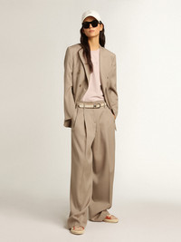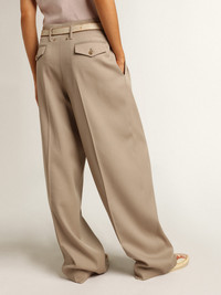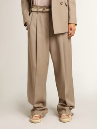 A collection that transports you into your most sincere and enveloping imagination, celebrating the beauty of life through simple yet irreplaceable instants - a story lived and seen through a dreamer’s eyes. These light beige pants in wool gabardine feature a high waist and tailored-style front stripes. DETAILS Item No. GWP01203.P000965.60398 - Journey collection - Color: light beige - Double gold star on the back - Four pockets - High waist - Wide leg - Main material: 100% wool - Lining: 64% viscose, 36% cupro - Pocket lining: 65% polyester, 35% cotton - Made in Italy The model is 177 cm tall and is wearing a size S.