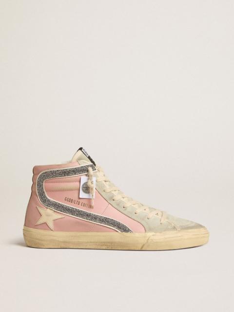 Skate soul, glamorous attitude. Our Slide sneakers take you straight to Venice Beach, between an ollie and a kickflip. With a pink leather upper, this model features a cream leather star and inserts in ice-gray suede, such as the heel tab and tongue. The silver Swarovski micro-crystal flash with white leather trim, and the cream laces complete the look. DETAILS Item No. GWF00115.F005246.25644 - Pink leather upper - Cream leather star - Ice-gray suede heel tab - Ice-gray suede tongue - Ice-gray suede inserts - Silver Swarovski micro-crystal flash with white leather trim - Cream laces - Vintage finish - Upper: 81% cow leather, 8% acrylic, 5% crystal, 3% polyurethane, 3% polyamide - Lining: 34% cotton, 31% cow leather, 23% polyurethane, 8% viscose, 4% polyester - Sole: 100% rubber - Handmade - Made in Italy