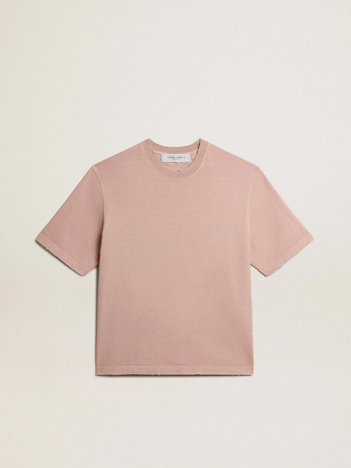 A unique, timeless collection that encapsulates the Golden Goose DNA, designed to remain with you every day, through thick and thin, come rain or shine. In powder-pink cotton with a distressed finish, this T-shirt with an Asian Market Exclusive fit features a raised reverse Golden logo on the back. DETAILS Item No. GUP01873.P001576.25235 - Color: powder pink - Reverse Golden logo on the back - Double gold star on the back - Relaxed fit - Asian Market Exclusive - Short sleeves - Distressed finish - Main material: 100% cotton - Made in Italy The model is 183 cm tall and is wearing a size M.
