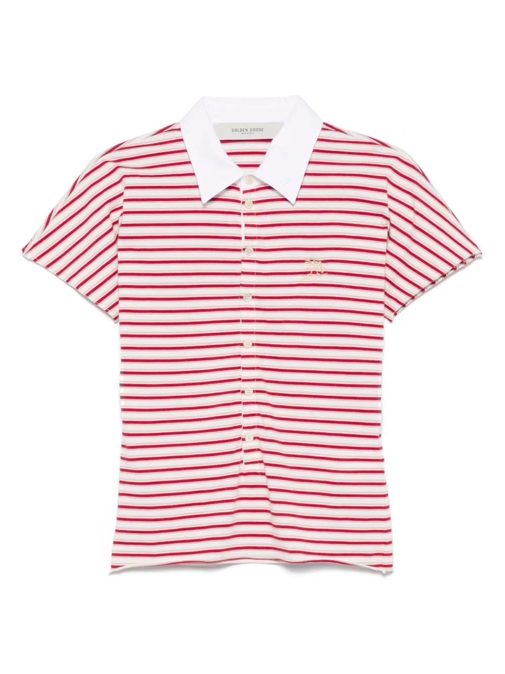 Natalia polo top Highlights - White - Front button placket - Embroidered logo at the chest - Short sleeves - Horizontal stripe pattern Made in Italy Composition Cotton 100% SIZE & FIT Model measurements Height 5 ft 10 in(1.78 m) Bust/Chest 33.46 in(85 cm) Hips 36.22 in(92 cm) Waist 23.22 in(59 cm) FittingInformation Designed for a slim fit that sits just away from the body offering a close yet comfortable fit Made from a midweight non-stretch fabric, this piece offers minimal elasticity when worn