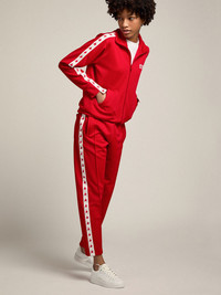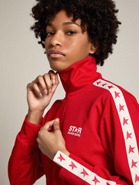 A collection with a casual soul but a versatile attitude: inspired by the Seventies, it has a timeless vintage appeal, suited to any occasion or look. With its zip and regular fit, this sweatshirt in red textured triacetate features a white grosgrain band on the sleeves with contrasting red stars. The contrasting logo on the front adds the finishing touch. DETAILS Item No. GWP00875.P000520.40380 - Color: red - White grosgrain band on the sleeves with contrasting red stars - Contrasting white logo on the front - Zip fastening - Long sleeves - Main material: 100% polyester - Made in Italy The model is 177 cm tall and is wearing a size S.