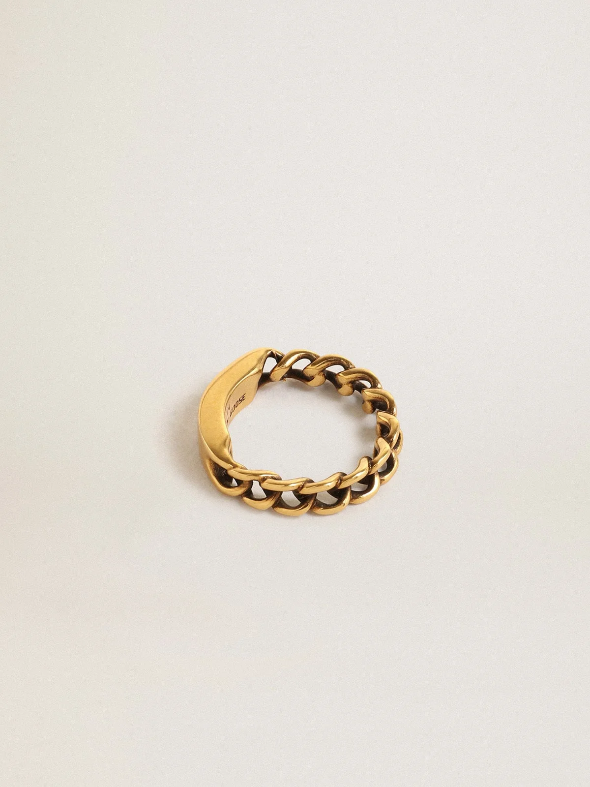 Linking past and present, embracing the never-ending love a memory keeps alive: the Jewelmates Collection is meant to be the companion of your everyday life. Made in old gold colored brass, this rigid ring with regular-sized links features “Golden Goose” lettering on the inside. DETAILS Item No. GWA00429.A000385.35341 - Ring with regular links - Color: old gold - "Golden Goose" lettering inside - Main material: 100% brass - Handmade - Made in Italy