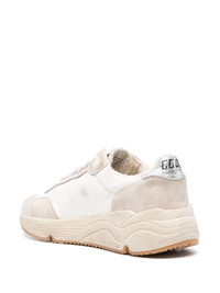 Running Sole distressed sneakers Stitched to the side of these sneakers, Golden Goose's iconic star patch represents the brand's handmade Italian construction. Produced with a chunky rubber sole and front lace-up fastening, the signature Running Sole design showcases a white and beige colourway. Highlights - White, ecru - Calf leather - Suede panels - Colour-block panelled design - Distressed effect - Round toe - Signature star patch to the sides - Debossed logo to the side - Logo patch at the tongue - Contrasting branded heel counter - Terry-cloth lining - Branded leather insole - Chunky rubber sole - Authenticity qr code - Front lace-up fastening Made in Italy Composition Leather 100% SIZE & FIT Measurement HEEL 1.18 in(3 cm) Sole height 0.98 in(2.5 cm)