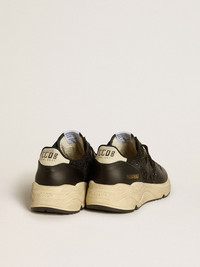 Urban style and a spirit of craftsmanship are combined in our Running Sole sneakers: the ideal companion for your metropolitan adventures. This model with a black glitter and leather upper features a black leather star and a cream-colored nubuck leather heel tab. And black laces add the finishing touch. DETAILS Item No. GWF00126.F006648.90184 - Black glitter and leather upper - Black leather star - Cream-colored nubuck leather heel tab - Black laces - Vintage finish - Upper: 60% cow leather, 26% polyethylene terephthalate, 14% cotton - Lining: 49% cotton, 26% polyester, 22% cow leather, 3% textile polyurethane - Sole: 100% rubber - Handmade - Made in Italy