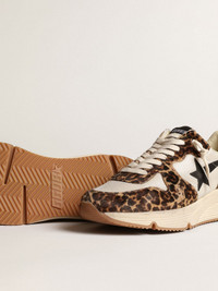 Urban style and a spirit of craftsmanship are combined in our Running Sole sneakers: the ideal companion for your metropolitan adventures. This model, with a cream-colored mesh upper accentuated with leopard-print pony skin inserts in beige and brown, features a black leather star and heel tab. And cream-colored laces add the finishing touch. DETAILS Item No. GWF00126.F003929.15399 - Cream-colored mesh upper with beige and brown leopard-print pony skin inserts - Black leather star - Black leather heel tab - Cream-colored laces - Vintage finish - Upper: 57% sheepskin leather, 40% polyester, 3% cow leather - Lining: 50% cotton, 30% cow leather, 15% textile polyurethane, 5% viscose - Sole: 100% rubber