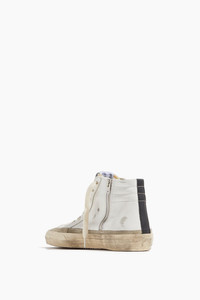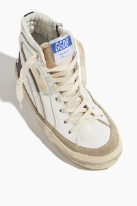 Your favorite high top sneakers are back. The Golden Goose Slide Leather Sneaker feature their signature distressed detailing with a zip side. - Fits true to size, take your normal size - High top sneakers - Lace up front - Distressed detailing - Side zip - Leather upper