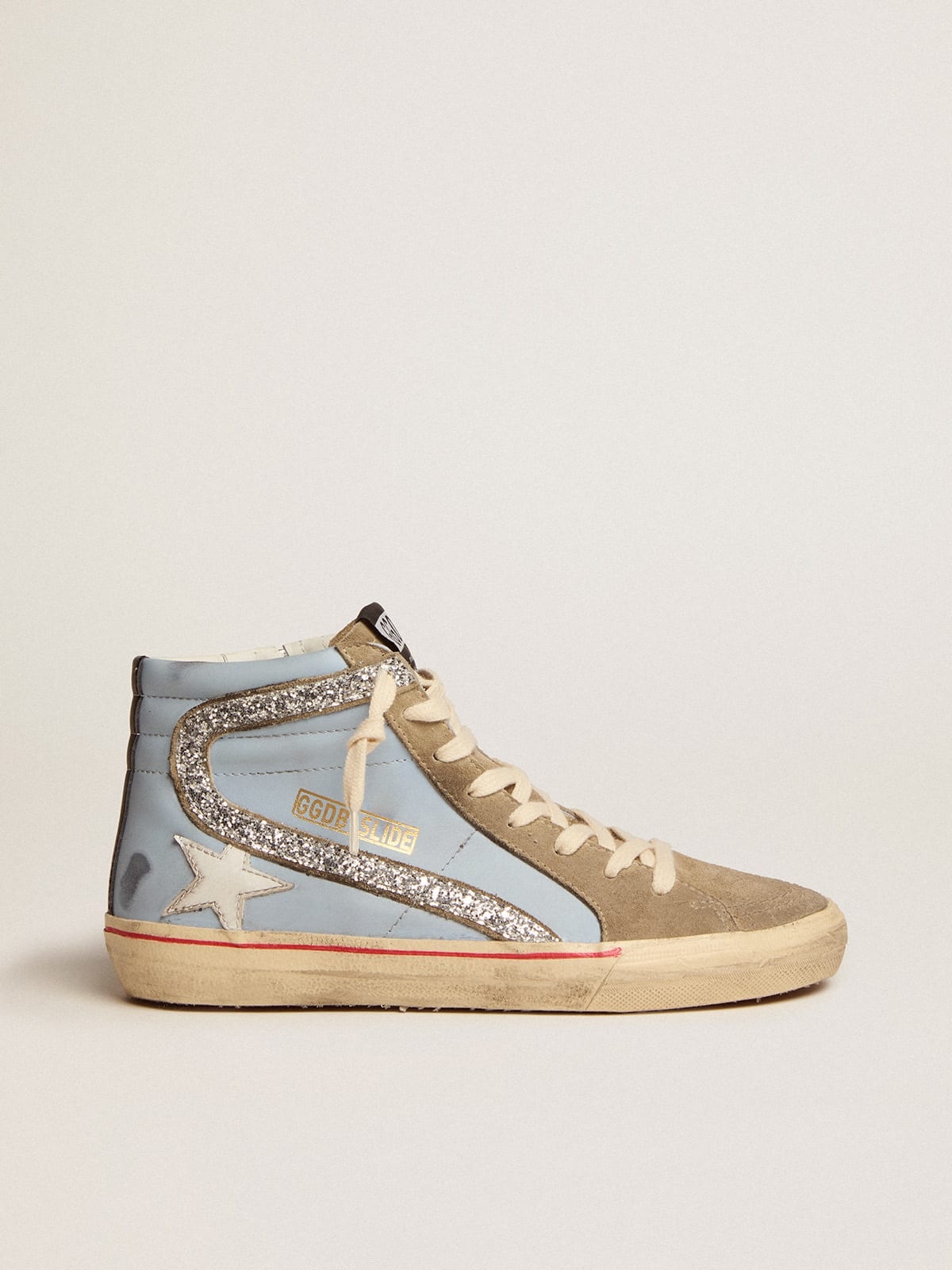 Skate soul, glamorous attitude. Our Slide sneakers take you straight to Venice Beach, between an ollie and a kickflip. This model with a powder-blue leather upper embellished with a silver glitter flash features a dove-gray suede tongue and inserts and a white leather star. The heel tab with black leather insert and the cream-colored laces add the finishing touches. DETAILS Item No. GWF00115.F002671.81567 - Color: powder blue - Dove-gray suede tongue - Dove-gray suede inserts - White leather star - Silver glitter flash with dove-gray edge - Heel tab with black leather insert - Cream-colored laces - Vintage finish - Upper: 95% cow leather, 4% polyethylene terephthalate, 1% cotton - Lining: 66% cow leather, 34% cotton - Sole: 100% rubber - Handcrafted - Made in Italy
