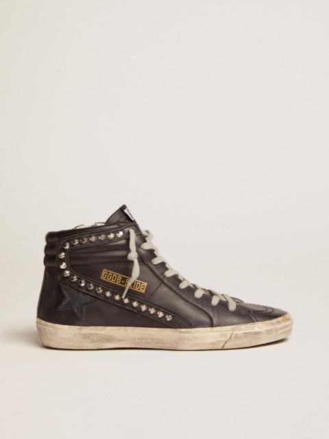 Slide sneakers with silver laminated leather upper and star-shaped studs