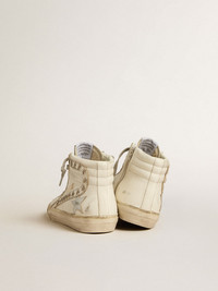Skate soul, glamorous attitude. Our Slide sneakers take you straight to Venice Beach, between an ollie and a kickflip. This model with an off-white leather upper features a silver metallic leather star and an off-white leather heel tab. The off-white leather flash with antique gold metal stars with silver metallic leather trim, and the ice-gray laces complete the look. DETAILS Item No. GWF00115.F005160.10449 - Color: off-white - Silver metallic leather star - Off-white leather heel tab - Off-white leather flash with antique gold metal stars with silver metallic leather trim - Ice-gray laces - Vintage finish - Upper: 93% cow leather, 7% sheepskin leather - Lining: 35% cow leather, 34% cotton, 19% textile polyurethane, 7% polyester, 5% viscose - Sole: 100% rubber - Handmade - Made in Italy
