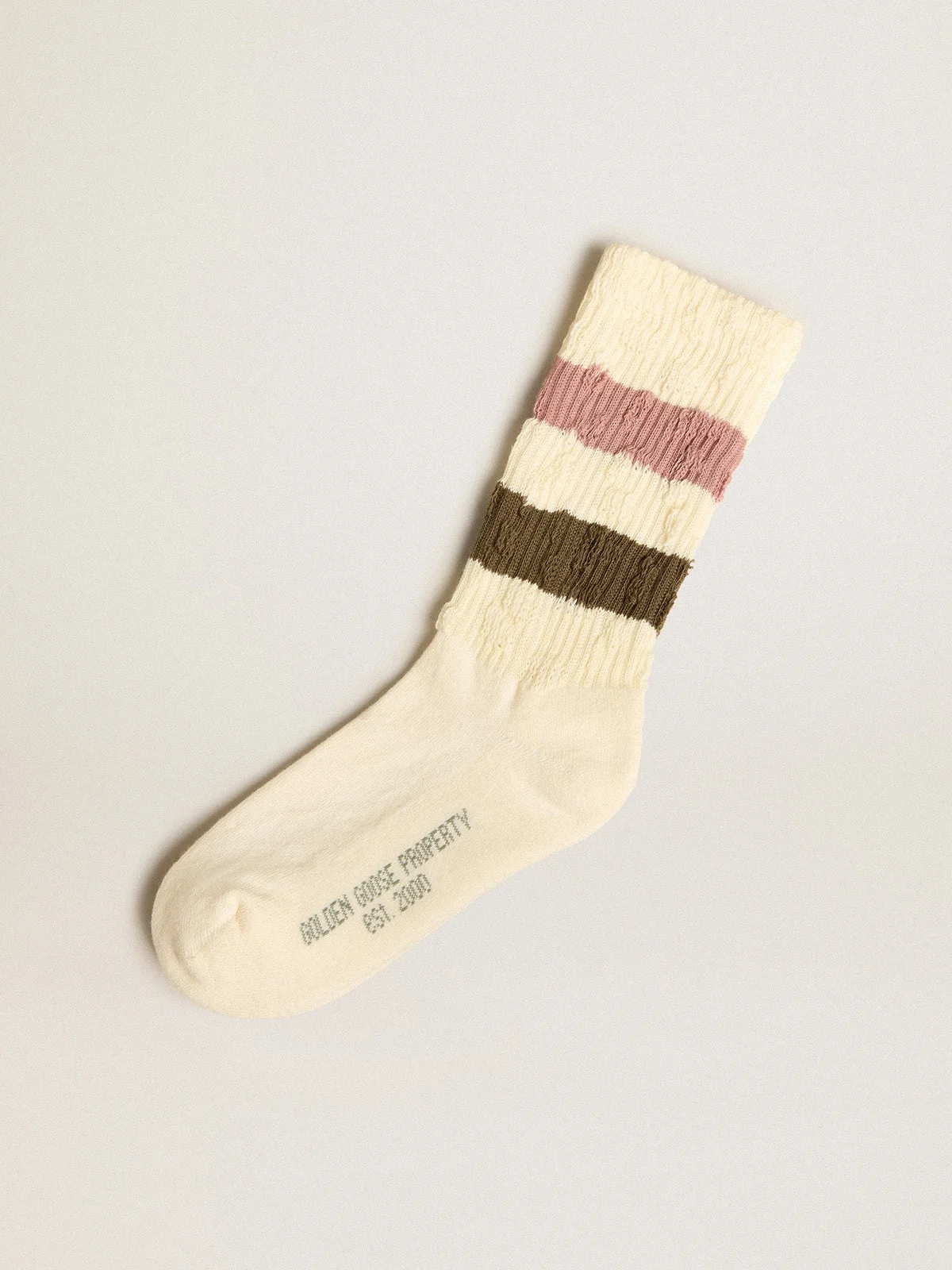 A vintage feel and craftsmanship are some of our distinctive components: socks in an aged white version, featuring distressed details on the leg and two-tone pink and brown stripes. DETAILS Item No. GUP00883.P000488.11810 - Journey Collection - Main material: 79% cotton, 19% polyamide, 2% spandex - Distressed details - Two-tone pink and brown stripes - Green ''Golden Goose property'' print on the sole - Unisex style - Made in Italy Size S corresponds to size 35-38