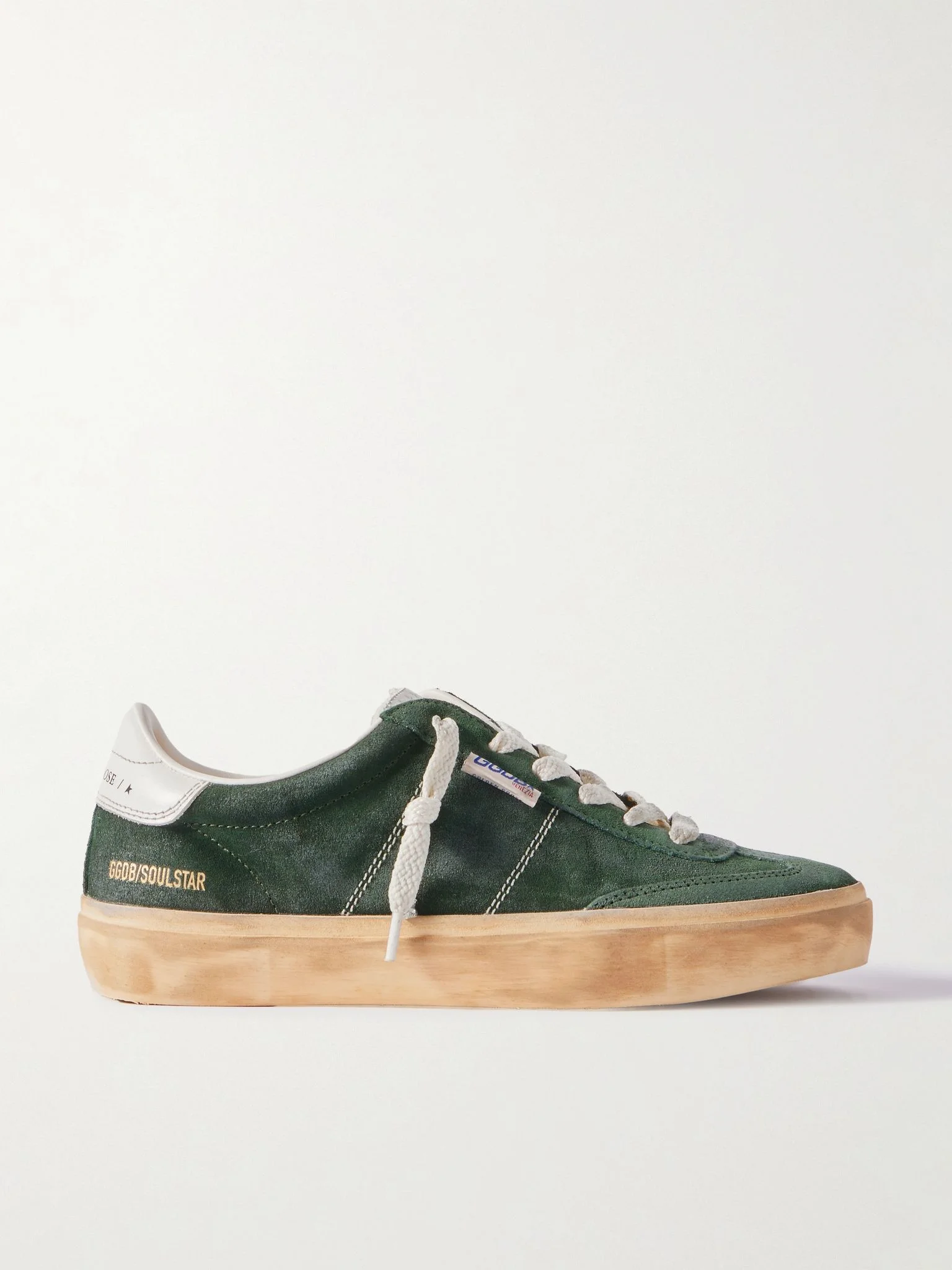It takes years to achieve the authentic broken-in look that Golden Goose's sneakers have fresh out of the box. This 'Soul-Star' pair is made from plush emerald-green suede panels and contrasting leather heels. Their rubber soles are lightly distressed with scratches and marks - the label calls them "perfect imperfections." Size & Fit - Fits true to size, take your normal size - Only available in full sizes, go down to the nearest whole size if you take a half size - Italian sizing Details & Care - Rubber sole measures approximately 25mm/ 1 inch - Green suede, white leather (Cow) - Lace-up front