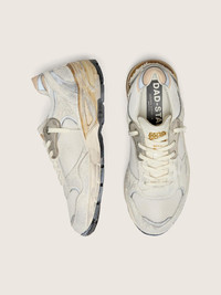 A soul with a wealth of stories to tell: our Dad-Star sneakers have timeless style, created to be passed down through the generations. With an abundance of sophisticated details, such as the yellowed sole expressing the idea of hanging your shoes in the sunlight, this women's model features a white suede and silver-colored mesh upper accentuated with a white leather star and a beige leather heel tab. The reflex fabric inserts and white laces add the finishing touch. DETAILS Item No. GWF00884.F002156.80185 - White suede and silver-colored mesh upper - White leather star - Beige leather heel tab - Silver eyelets - White laces - Vintage finish - Upper: 50% cow leather, 28% polyamide, 18% textile polyurethane, 4% glass fiber - Lining: 50% cow leather, 40% cotton, 10% textile polyurethane - Sole: 100% rubber - Handmade - Made in Italy
