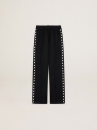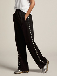A collection with a casual soul but a versatile attitude: inspired by the Seventies, it has a timeless vintage appeal, suited to any occasion or look. Inspired by the world of tailoring, echoed by the stitched pleat on the front, these joggers in black technical jersey feature a wide leg. The tone-on-tone grosgrain strip on the sides of the legs with contrasting white stars adds the finishing touch. DETAILS Item No. GWP00877.P000521.80203 - Star Collection - Color: black - Wide leg - Three pockets - Black grosgrain strip on the sides with contrasting white stars - Main material: 100% polyester - Pocket lining: 100% cotton - Made in Italy The model is 177 cm tall and is wearing a size S.
