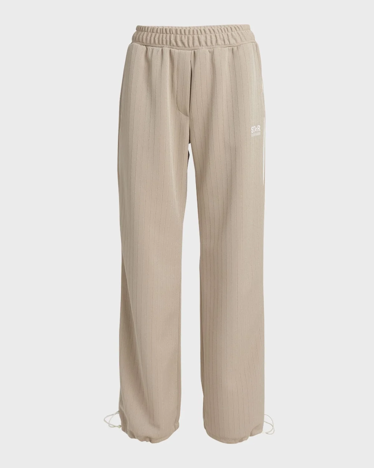 Golden Goose "Star" track joggers featuring a logo print in a technical cottonpoly fabrication Midrise; sits high on the hip Elastic waistband Side pockets; single back pocket Wide legs Drawstring hem Pullon style Polyester Dry clean Imported