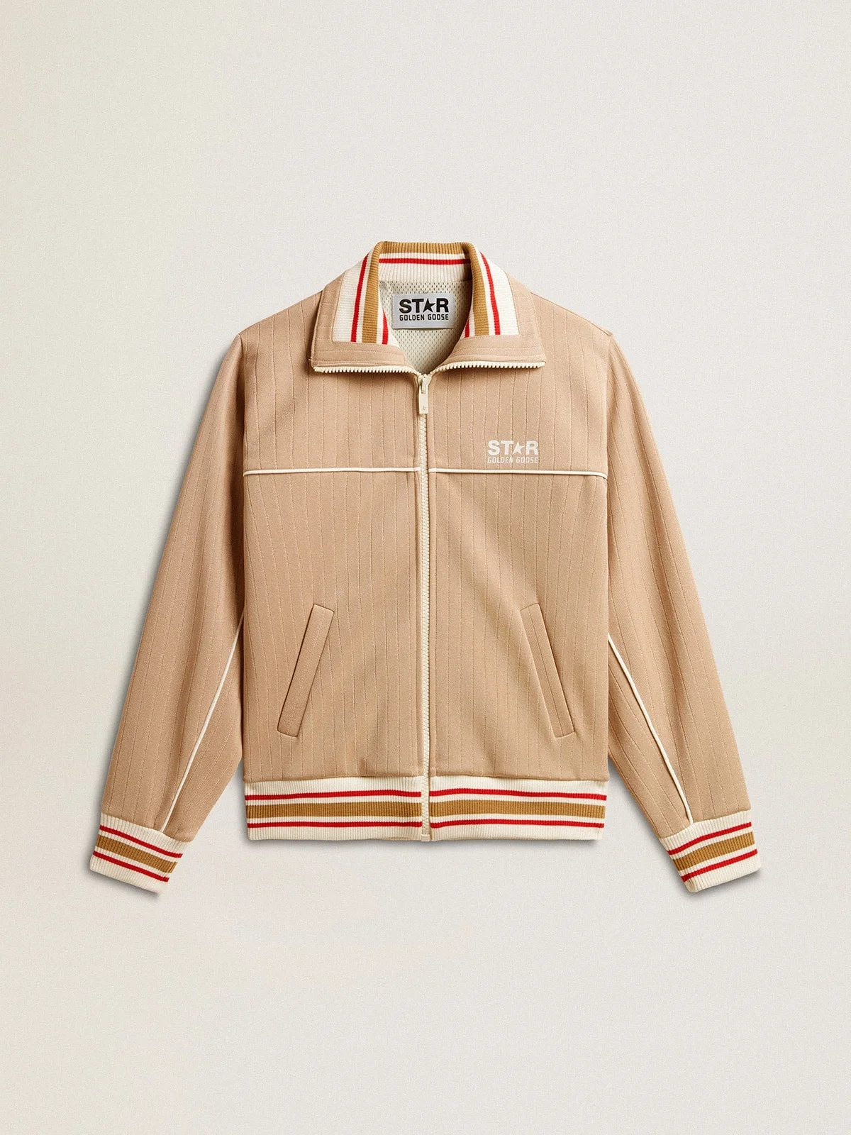 A collection with a casual soul but a versatile attitude: inspired by the Seventies, it has a timeless vintage appeal, suited to any occasion or look. With a concealed zipper, this women’s regular fit sweatshirt in light beige technical jersey features pinstripe rib knit on the collar, cuffs and hem. The logo print on the chest and the two pockets on the front complete the look, along with the contrast piping on the seams. DETAILS Item No. GWP02020.P001653.15633 - Star Collection - Color: light beige - Ribbed edges - Contrasting white logo on the front - Two pockets - Long sleeves - Concealed zip fastening - Contrast piping - Regular fit - Mesh lining - Main material: 100% polyester The model is 177 cm tall and is wearing a size S.