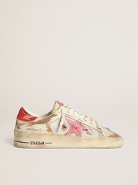 The glorious Nineties wrapped up in a sneaker. The Stardan sneakers pay homage to the basketball icons of that decade, while keeping an eye on the present. These limited edition, numbered LAB sneakers with a white leather and mesh upper feature a star and heel tab in red laminated leather. And white laces add the finishing touch. DETAILS Item No. GWF00128.F003534.10350 - White leather and mesh upper - Red laminated leather star - Red laminated leather heel tab - White leather toe - White laces - Vintage finish - Upper: 67% cow leather, 18% polyamide, 11% sheepskin leather, 4% spandex - Lining: 60% cow leather, 40% cotton - Sole: 100% rubber