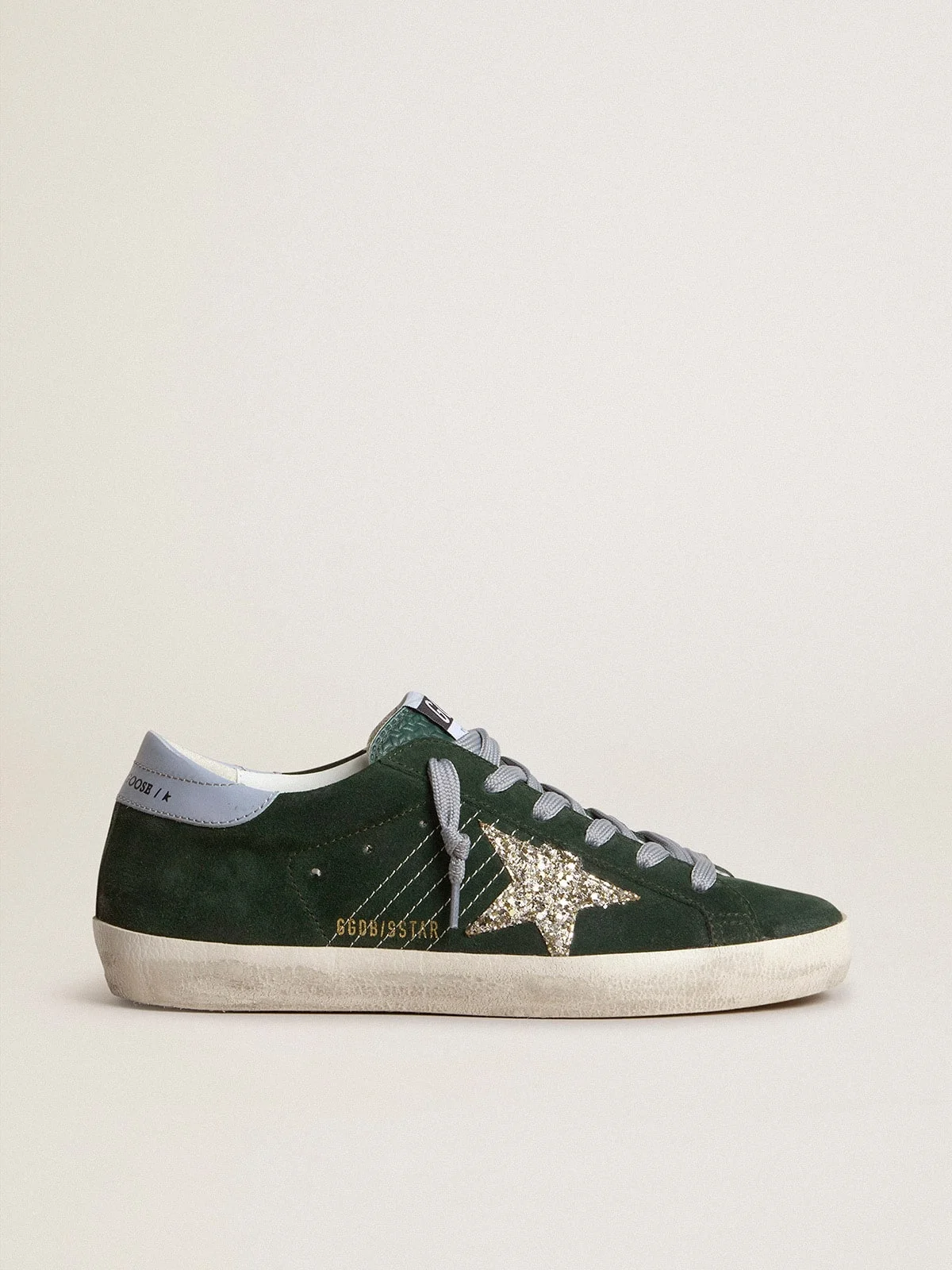 A timeless icon yet one that’s constantly evolving. At Golden, we love taking our classics and reworking them all the time, always from a new angle. With a forest green suede upper, these women’s Super-Star feature a silver glitter star and ice-gray leather heel tab. Gray laces add the finishing touch. DETAILS Item No. GWF00101.F007200.35923 - Green suede upper - Silver glitter star - Gray leather heel tab - Gray laces - Vintage finish - Upper: 80% cow leather, 9% polyurethane, 8% nylon, 2% polyethylene terephthalate, 1% cotton - Lining: 41% cotton, 31% cow leather, 18% polyurethane, 6% polyester, 4% viscose - Sole: 100% rubber - Handmade - Made in Italy